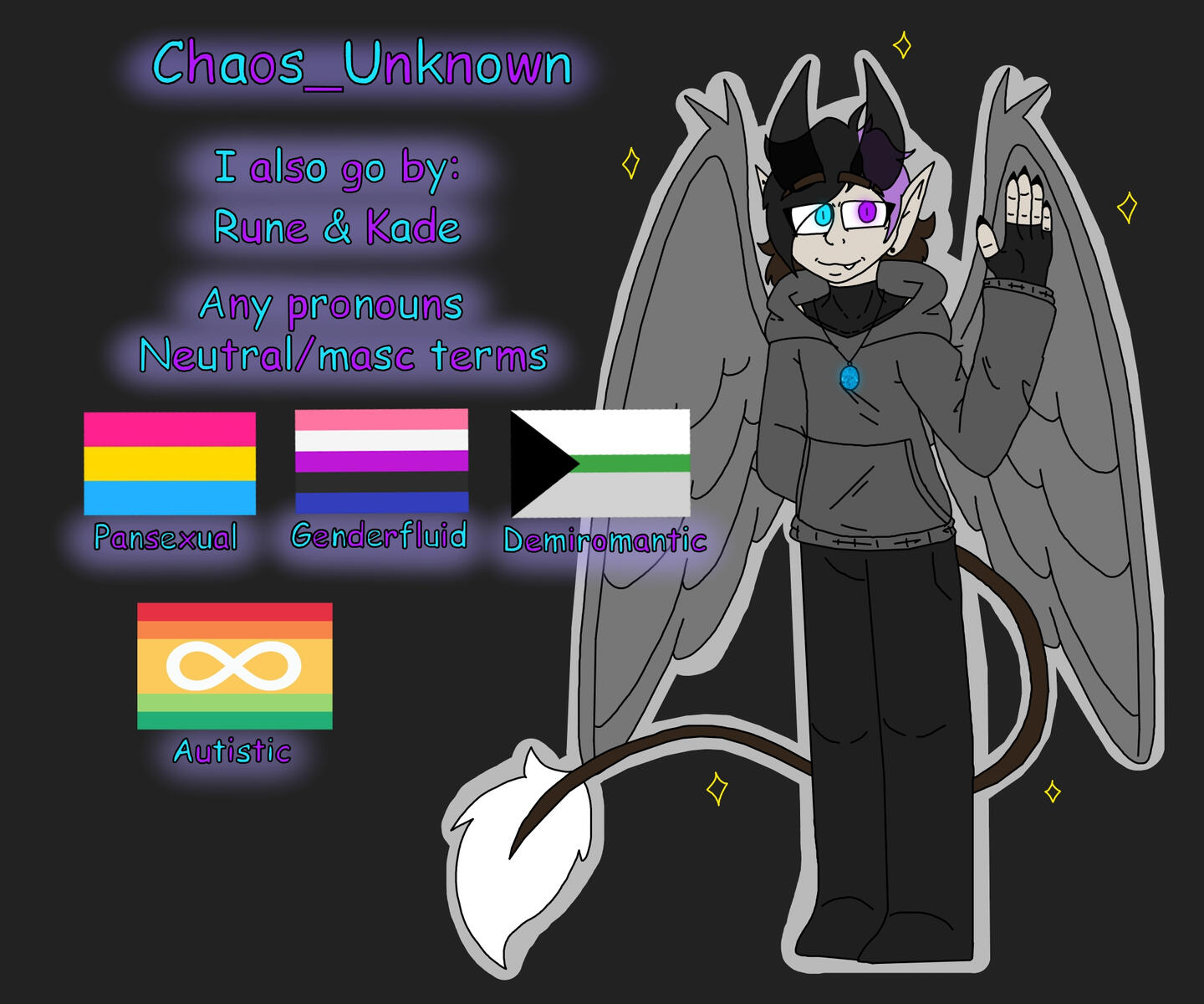 Since I'm autistic, my gender identity is kinda... iffy. SO I have some xenogenders! (Xenogenders are micro-labels!)The first one is Stargender, a xenogender that describes a gender that is otherworldly, non-human, or beyond human comprehension, often likened to the nature of a star!The second is basically genderfluid people who use xenogenders, like me!